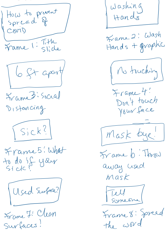 Concept Description: The video will not narrate the instructions. Instead, images of the action steps will be presented with a short description of each step. This is fairly straight forward and quickly allows the users to learn what they need to do or not do to prevent the spread of the virus. Mellow audio is playing the background to add musicality to the video without distracting the viewer but also keeping them engaged.