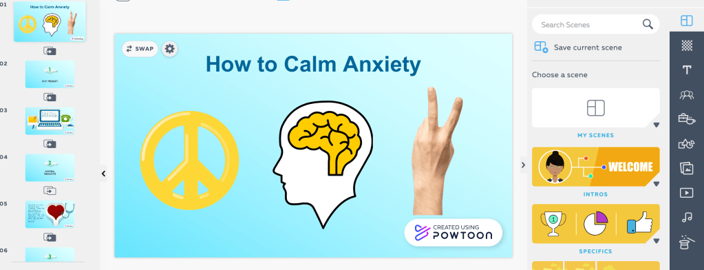 I used Powtoon to create this instructional video that contains tips to help calm people down from an anxiety attack. I really liked this platform as they provided templates to for users to update. Within the platform I was able to edit the slides’ graphics, theme elements and update the language. This made it very customizable which I appreciated. However, I really struggled with perfecting the video timing in this platform. I think some slides are up for too long or when there are multiple objects on a slide, the order in which they appear and how long they are on screen is off timing wise. I will definitely need to work on fine-tuning timing when working with videos.