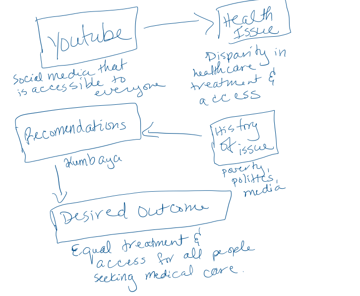 Concept Description: The video starts off with 2 couples in the doctor’s office. The doctor is very welcoming to the white couple, but he is refusing to provide service to the black couple, so the audience sees that they have to leave the office. I narrate the main topic of the video. The next scene is in a poorer neighborhood which is poorly lit, and the characters look sad. It demonstrates the doom of poverty. My narration describes the relationship between poverty and health care. I then touch on the disunity within the political system, the screen is cracked to symbolize how broken the system is when it comes to ideas such as universal healthcare. Lastly, I addressed the media’s influence on shaping people’s perspective. This scene features a family listening to the television in their home. Then I provide recommendations which features a group of people of diverse backgrounds at an event in the park. In the last section of the narrative, we are back to the doctor’s office scene and we see that the couple that was originally turned away are now welcomed at the office.